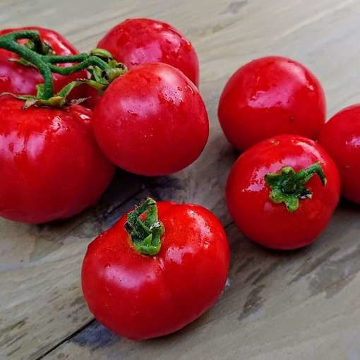 Valgomieji pomidorai ‘Rotkappchen’ – tai vidutinio ankstyvumo, riboto augimo (neaukšti), galima auginti  lauke ir šiltnamiuose. Vaisiai plokščiai apvalūs, raudoni, salotinio tipo, sveria apie 100g, skanūs.