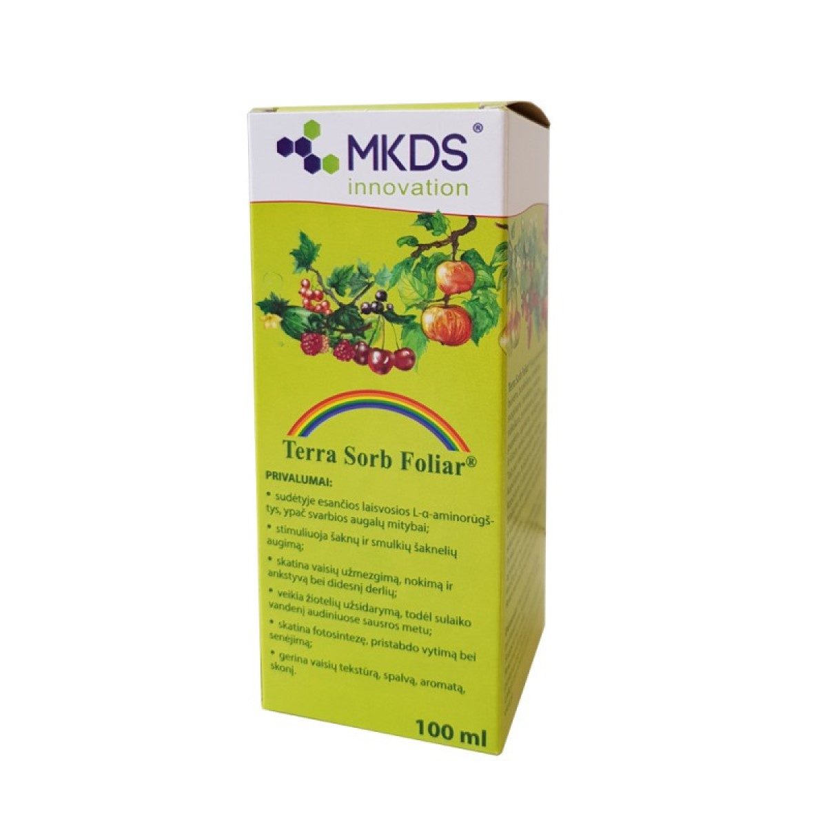 | Kaulavaisiai (slyvos, vyšnios, persikai ir pan.), sėklavaisiai (obelys, kriaušės, svarainis ir pan.) | Nuo žydėjimo iki derliaus nuėmimo, kas 7-14 d. Žydint, metant žiedlapius, vaisių vystymosi metu, kartu su augalų apsaugos produktais. | 100 ml | Pagerina vaisių kokybę. Vienodesnio dydžio vaisiai. Sumažina defektus vaisiuose. Pagerina augalų apsaugos produktų absorbciją. |