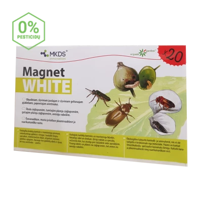 MAGNET WHITE – tai lipni balta gaudyklė, ištepta specialiais, vandeniui atspariais entomologiniais klijais. Apsaugo nuo pjūklelių obelis ir slyvas bei nuo avietinuko – avietes. Klijai paruošti taip, kad smulkesni ir silpniau skraidantys vabzdžiai prilimpa, o stambesnieji, tokie kaip bitės ar kamanės, geba nuskristi.