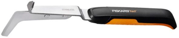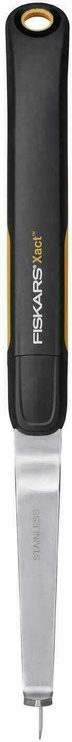 FISKARS Xact small weeding knife – tai dviejų ašmenų Xact ravėjimo peilis piktžolių ir samanų šalinimui tarp trinkelių, takelių dangos akmenų ir plytelių. Dvipusiai nerūdijančio plieno ašmenys patogiam piktžolių ravėjimui ir sąmanų išgrandimui. Dėl patogaus ilgesnės rankenos dizaino su SoftGrip™ medžiaga (neslystanti), įrankį galima įvairiai laikyti, o ilgesnė rankena prireikus galima suteikia daugiau jėgos. Patogi skylė rankenoje skirta įrankio sandėliavimui.